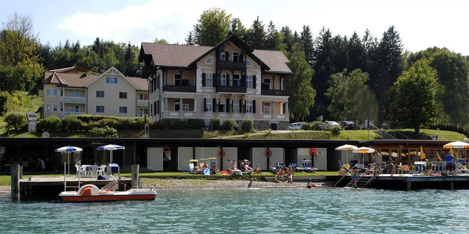 Strandbad und Café bieten ein privates Ambiente mit kostenlosen Sonnenliegen, Schirmen und Kabinen. Die Marina ermöglicht Bootsausflüge auf dem Wörthersee. Wassersportaktivitäten wie Tretbootverleih, Wasserski, Wakeboard und Tube sind direkt am Strandbad verfügbar.